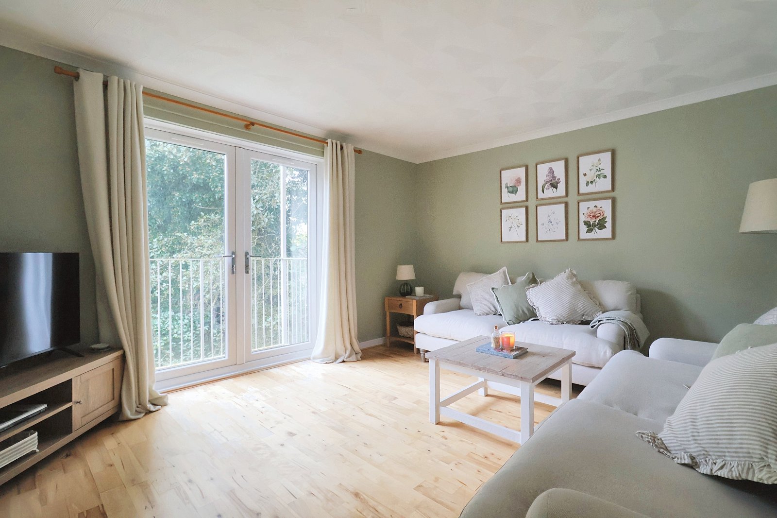 The accommodation comprises: welcoming Hallway with generous storage; bright Lounge with French doors opening onto a private Balcony; stylish Kitchen fitted with modern cabinets, oven, electric hob and tiled splash; two well-proportioned Bedrooms, one with fitted wardrobes; and a contemporary tiled Bathroom featuring a modern white suite and electric shower.